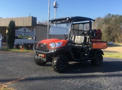 | Kubota side by side that carries 85 gallons of water and capable of carrying a stokes basket for off road rescue. This unit also features a removable snow plow for clearing the station's pad during inclement weather. |